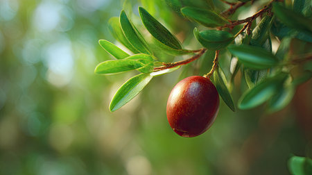 A detailed photograph of a single Jujube, swaying gently in the wind, captured in natural daylight. Fresh and airy atmosphere, soft motion blur on leaves, crisp details on textures, background softly blurred into natural greenery, cinematic natural light, realistic photography style.