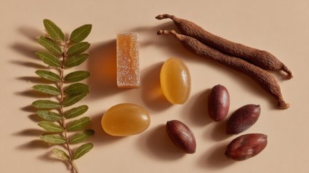 Natural supplement ingredients including herbs, gummies, capsules, and dried botanicals arranged artistically on neutral background for wellness and health concept.