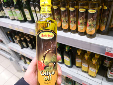 Glass bottle of natural olive oil Iberica in hand against the background of the counter of sale of oil in the retail grocery store on May 5, 2020 in Russia, Tatarstan, Kazan, Richard Zorge Street 11b