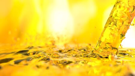 Liquid yellow retinol cosmetic serum or vitamin C gel or essential oil on petri dish close up.