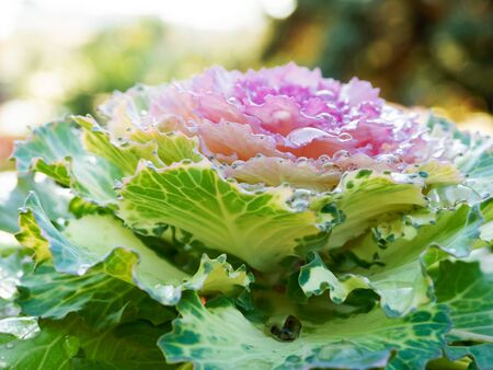 Brassica oleracea var. acephala, close up photo of decorative plant with morning dew drops.