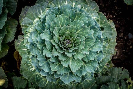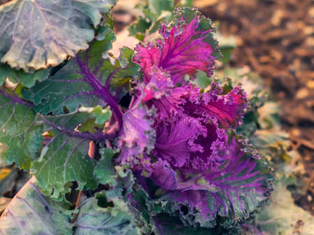 Ornamental kale in the backyard or farmer's bed. A colorful vegetable. Selective Focus.
