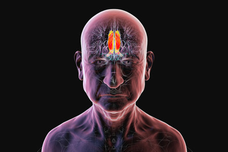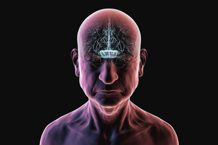 Human brain with highlighted hippocampus in a senior person, a key structure involved in memory, learning, and emotional regulation, 3D illustration. Front view.