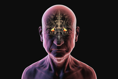 Human brain in a senior person with degenerated substantia nigra in Parkinson's disease, showing loss of pigmented neurons in the midbrain related to motor dysfunction, 3D illustration. Front view.