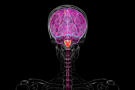 Medulla oblongata highlighted in human brain, 3D illustration. Controls breathing, heartbeat, and other vital autonomic functions.
