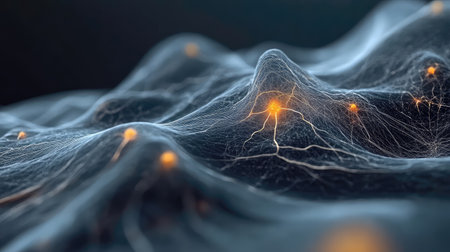 Intricate abstract visualization captures the essence of neural connections and digital networks, highlighting luminous nodes and flowing patterns in a captivating dark landscape.