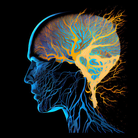 Depiction of human anatomy highlighting cranial and vascular systems with intricate detail and vibrant colors against a dark background