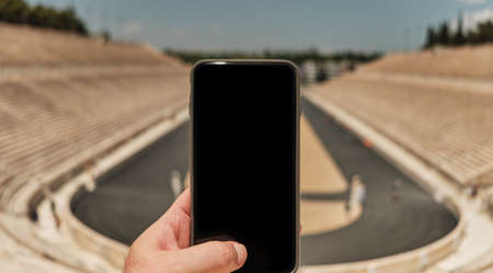 Travel concept - tourist taking photo with smart phone in a sunny day in the capital of Greece - Athens