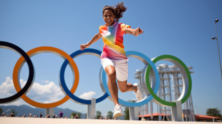 A young woman smiles as she runs past the Olympic rings.