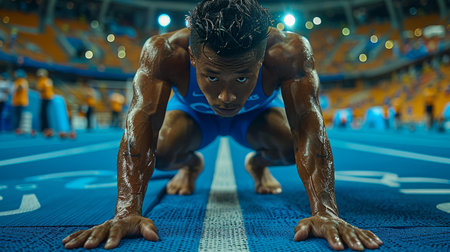 Portrait of a focused male athlete at the start of a sporting event in a stadium