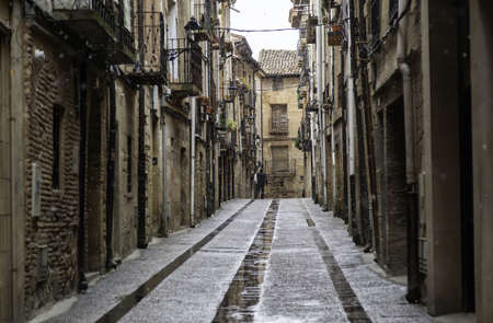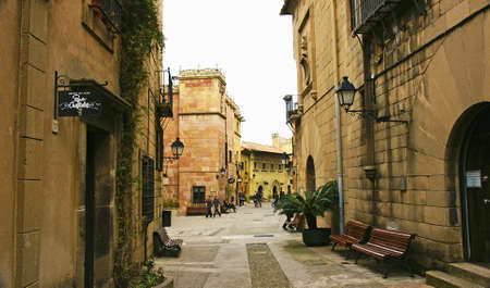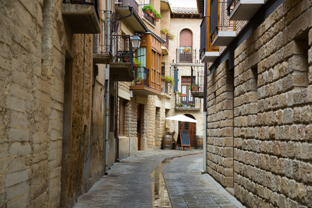 A vertical shot of a typical street in the city center in Laguardia, Alava, Spain
