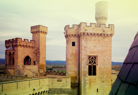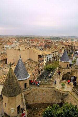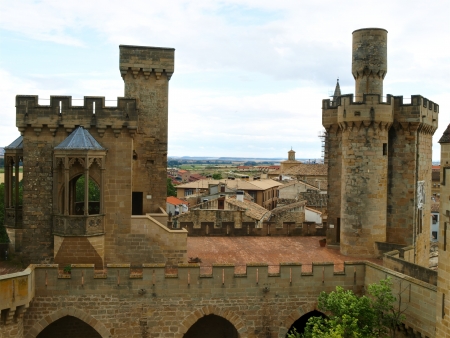 Olite, Erriberri, Navarra, Spain; 08/21/2007: Towers of the Royal Palace of Olite and bell tower of the Church of San Pedro with the city of Olite in the background on a cloudy day