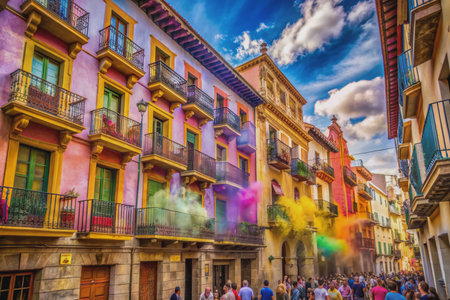Vibrant colors of powdered flour dust a historic Spanish town's streets, ornate balconies, and ancient architecture during the festive annual Els Enfarinats celebration.