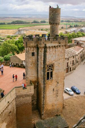View of the historic town of Olite in Navarra, Spain, with a castle visited by tourists.