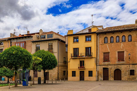 Medieval stone houses surrounding a park on Plaza de los Teobaldos Town square in Olite, Spain famous for a magnificent Royal Palace castle