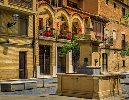Medieval stone drinking fountain on Plaza Carlos III El Noble town square near the magnificent Royal Palace castle in Olite, Spain