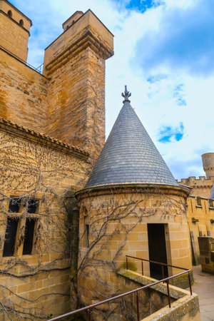 Olite, Spain - June 23, 2021: Tower of of the ornate gothic architecture of the palace of the Kings of Navarre or Royal Palace of Olite in Navarra