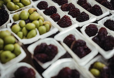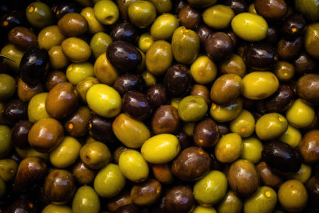 Fresh organic red, green, yellow and black olives displayed for sale at Naschmarkt a street food market in Vienna, Austria, healthy Greek vegan food photographed with soft focus