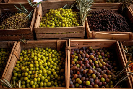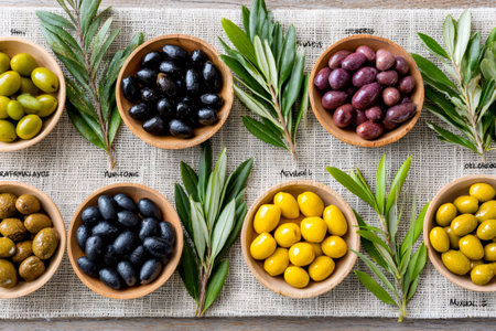 Variety of colorful olives arranged in wooden bowls with olive branches, creating a vibrant and appetizing display on a rustic tablecloth