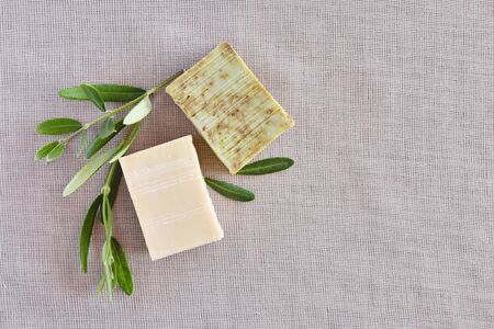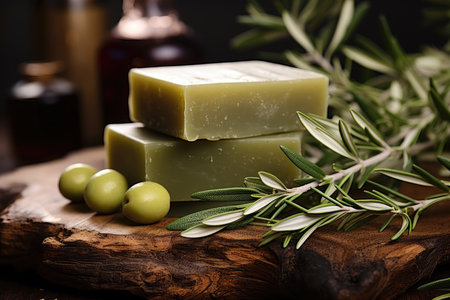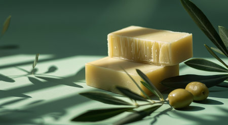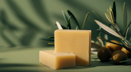 Two bars of natural soap sit on a green surface, with an olive branch and fruit in the background.