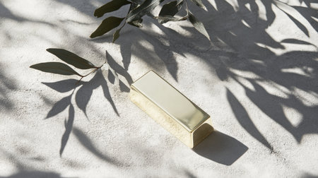 A stunning gold object rests on a textured surface, casting delicate shadows from surrounding leaves, creating a serene and minimalistic ambiance.