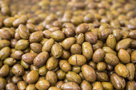 Green olive beside other ones with different shades of color and ripening. Preparing seasoned table olives