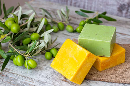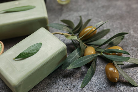Handmade soap bars, olives and green leaves on gray textured table, closeup