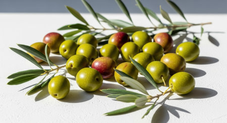A high-angle, close-up shot captures a cluster of freshly picked olives scattered across a clean, textured white surface. The collection showcases a variety of olives, primarily bright green, mixed with several fruits that are turning reddish-purple, signifying different stages of ripeness. Several sprigs of fresh olive leaves and branches are intertwined with the fruit, adding a natural and organic element to the composition. The bright natural lighting illuminates the smooth skin of the olives and creates soft, defined shadows, enhancing the depth against the minimalist background. This image evokes themes of harvest, Mediterranean cuisine, and healthy eating.