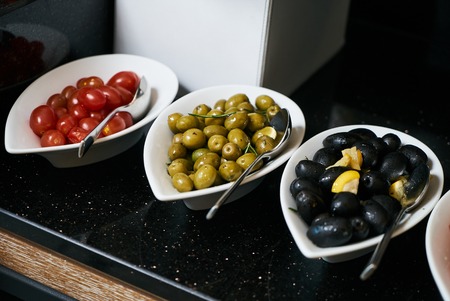Cold cuts tray and marinated snacks food, close-up. Meat delicatessen plate with cherry tomato, black and green olives and pepper. Hotel restaurant buffet catering service table concept