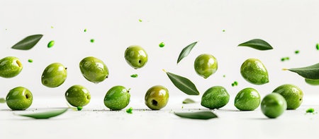 Fresh green olives tumble through the air, glistening with droplets, showcasing their vibrant colors against a stark white background.