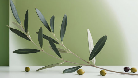 olive, a symbol of peace and prosperity, sits elegantly on a rustic white chalkboard, surrounded by subtle shadows, creating a stunning flat lay view banner perfect for mediterranean-inspired recipes, healthy eating, and culinary art designs, evoking feelings of serenity and warmth. ai generated