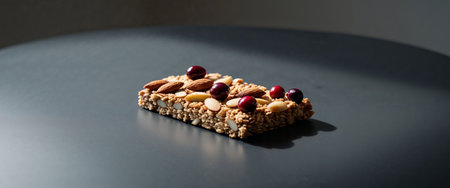 AI Generated. Homemade granola bar with almonds and cranberries on dark table