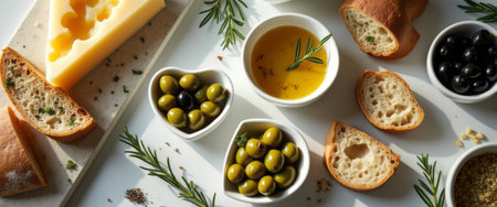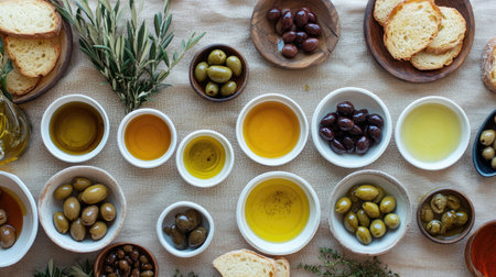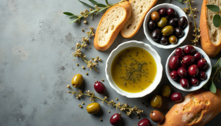 A rustic arrangement features bowls of vibrant olives and a dish of golden olive oil, surrounded by slices of crusty bread. This image captures the essence of Mediterranean cuisine, inviting viewers to indulge in the rich flavors and textures of a delightful appetizer.