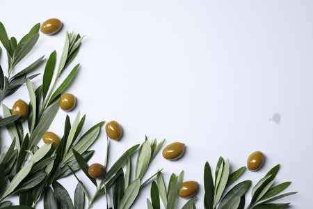 Twigs with olives and fresh green leaves on white background, flat lay. Space for text