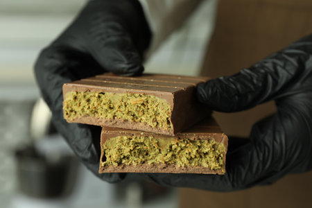 Woman holding pieces of tasty chocolate with pistachios and knafeh indoors, closeup