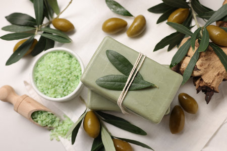 Natural soap bars, olives and sea salt on white marble table, flat lay