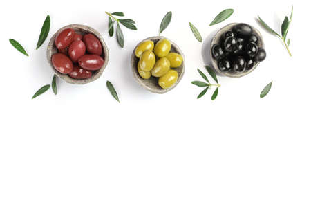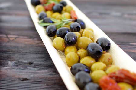 A collage of various types of salted and marinated olives. Mediterranean cuisine, restaurant menu concept.