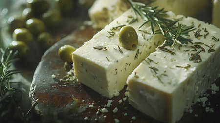 Square pieces of feta cheese sprinkled with fresh rosemary sprigs and green olive on a wooden surface offer a rustic, culinary-inspired visual.