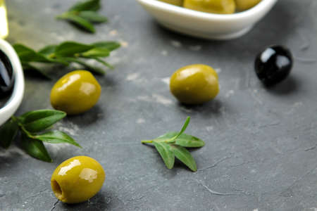 Green and black olives in a white ceramic bowl with leaves on a dark graphite background. close-up