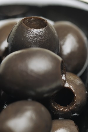 Group of six whole tasty black olive on wooden board isolated on black glass
