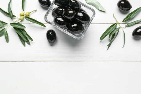 Composition with bowl of tasty black olives and leaves on light wooden background