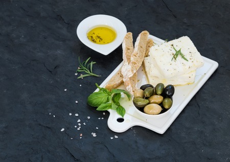 Fresh feta cheese with olives, basil, rosemary and bread slices on white ceramic serving board over black slate stone background, selective focus, copy space