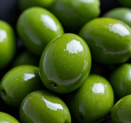 Closeup view of fresh green olives. Early harvest. Healthy eco food. Product of organic farming.