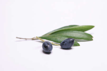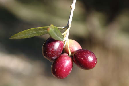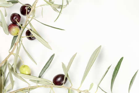 Close up photo of olive branch or twig. Ripe olives with green leaves as a symbol of Mediterranean diet concept.