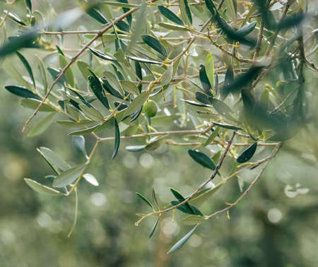 Alone green olive on the olive tree branch with unfocused blurred background with green foliage and bright morning dew drops on the leaves. Eco food and a Mediterranean agriculture concept image