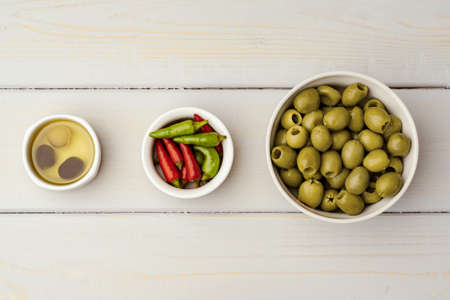 Spicy green olives are poured with olive oil with spices. Copy space.