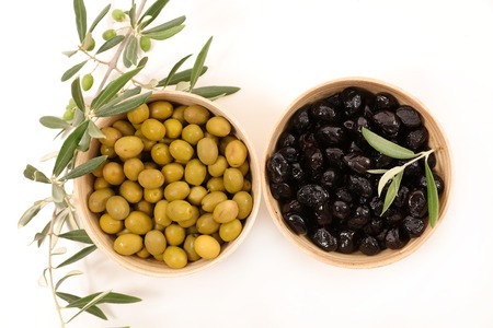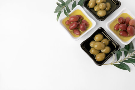 Olive branches with salted olives placed on a white background with copy space. View from above