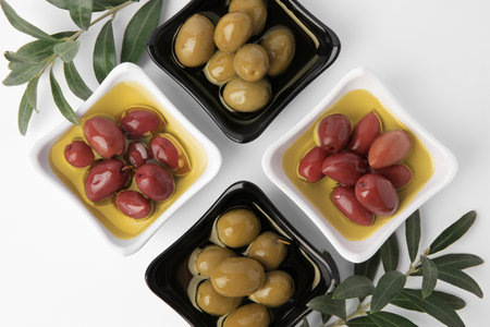 Bowls with different ripe olives and leaves on white background, flat lay. Space for text