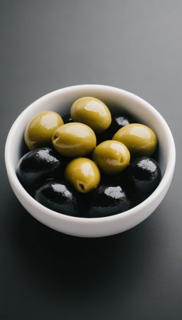 Green and black olives in a white ceramic bowl with leaves on a dark graphite background. close-up