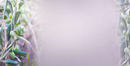 Banner with green olives growing on a tree, place for text
